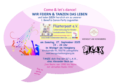 Flüsterpost e. V., der Verein zur Unterstützung von Kindern krebskranker Eltern, lädt am 27. September von 19 bis 24 Uhr zur ersten Benefiz-Dance-Party ins Weingut am Honigberg in Ludwigshöhe ein. DJ L.A.X. sorgt für Musik von den 90ern bis zu aktuellen Hits, dazu gibt es kleine kulinarische Angebote und eine Fotobox. Der Eintritt ist frei, Spenden sind willkommen.