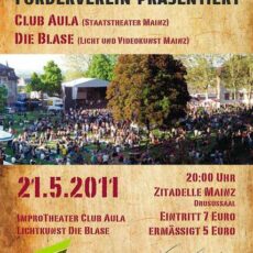 Der Open Ohr Förderverein präsentiert: Improvisationstheater von Club Aula verbunden mit einer visuellen Reise der Licht- und Videokünstler „Die Blase“. An diesem Abend dreht sich alles um das Thema des diesjährigen Open Ohr „Rien ne va plus – nichts geht mehr“. Die Blase wird „Die Finanzkrise“ in Bildern auf die Mauern der Mainzer Zitadelle projizieren. […]