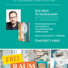 Der Autor Jochen Schliemann liest aus seinem aktuellen Buch „P – Trauriges Reisen“ im „Freiraum“ in der Nackstraße. Tim Ross, der ‚Held‘ in Jochen Schliemanns Roman „P – trauriges Reisen“ verläuft sich auf dem Weg zur Arbeit – und verschwindet. Er beginnt eine bizarre Reise um die Welt (u. a. Kenia, Argentinien, Jamaica, Kuba, USA, Japan, […]