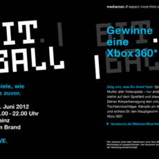Am Montag spielen Menschen Am Brand die Mutter aller Videospiele auf der Straße: Das Spielfeld bilden Beamer und Xbox, die Schlagflächen werden per Körperbewegung gesteuert. Die Idee stammt von mediaman-Mitarbeitern aus Mainz, die Spaß am Spiel und technischen Tüfteleien haben. (www.facebook.com/WeisserWuerfel oder www.tinkerding.de/2012/06/18/bitball-kinect).