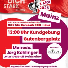 Unter dem Motto „Mach dich stark mit uns!“ geht der Deutsche Gewerkschaftsbund gemeinsam mit seinen Gewerkschaften am 1. Mai auf die Straße, um die Stimme für eine gerechte Arbeitswelt zu erheben. Die Demo startet um 11.30 Uhr ab dem DGB-Haus in der Kaiserstraße. Ab 13 Uhr findet eine Kundgebung auf dem Gutenbergplatz statt.