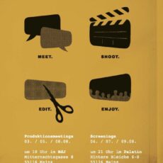 Schlummernde Drehbücher aus der Schublade ziehen und aufgepasst!: zum bereits sechsten Mal dürft Ihr auch in diesem Jahr wieder Euren eigenen Kurzfilm drehen. Mit der freundlichen und fachmännischen Unterstützung von KinoMainz e.V. erstreckt sich die Produktionsdauer vom 2. bis 9. August und findet ihren gebührenden Abschluss mit einer großen Filmpräsentation im Palatin.