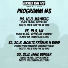 Und es kommt u.a. LIN am Freitag, aber auch Enno Bunger am Sonntag, Moritz Krämer am Samstag und natürlich Mayberg am Donnerstag. Tickets unter www.musikmaschine.net!