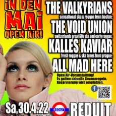 Auch die Open-Air Saison in der Reduit ist zurück. Das Publikum kann sich wieder auf jede Menge Offbeat Rhythmen und Uptempo Nummern freuen. Mit dabei sind diesmal vier Bands aus vier Ländern: Mit All Mad Here aus Prag, Kalles Kaviar aus der Schweiz, The Void Union aus Boston und The Valkyrians aus Helsinki geht’s im […]