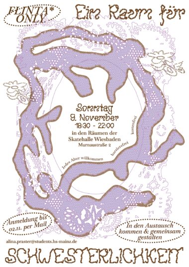 Am Sonntag, 9. November, von 18:30 bis 22:00 Uhr lädt die Kommunikationsdesignerin Alina Praster im Rahmen ihrer Bachelorarbeit an der Hochschule Mainz zum Raum für Schwesterlichkeit in die Skatehalle Wiesbaden ein. Der Abend richtet sich an FLINTA*-Personen und bietet Raum für Austausch, gemeinsames Gestalten und gegenseitige Stärkung. Eine Anmeldung ist bis zum 2. November per E-Mail an alina.praster@students.hs-mainz.de möglich.
